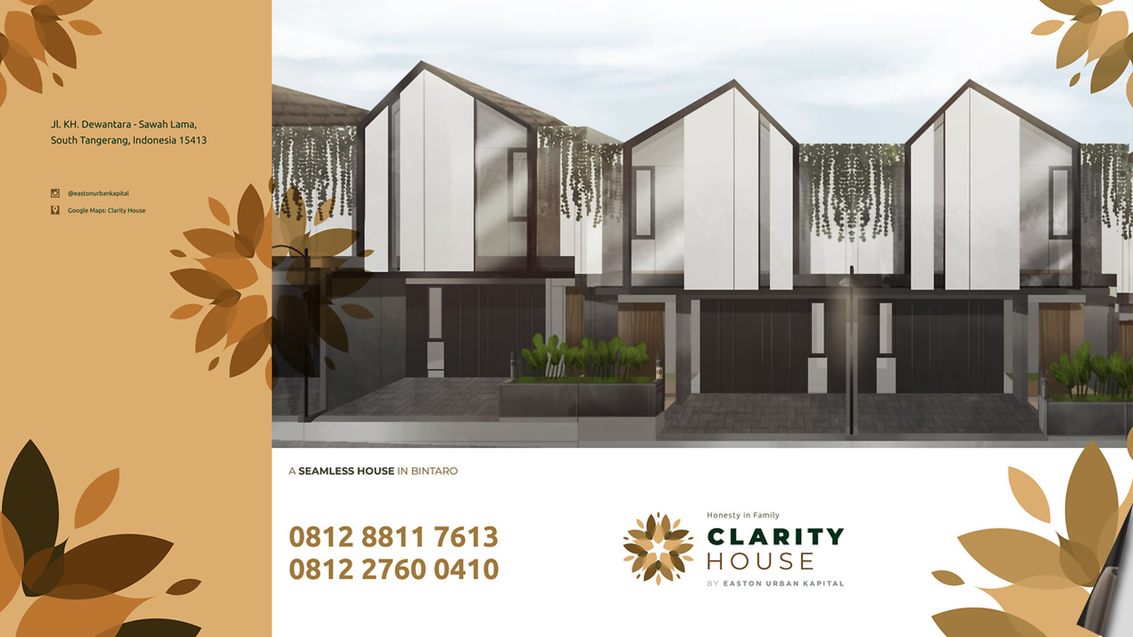 Jl. KH. Dewantara - Sawah Lama,South Tangerang, Indonesia 15413@eastonurbankapitalGoogle Maps: Clarity HouseA SEAMLESS HOUSE IN BINTARO0812 8811 76130812 2760 0410